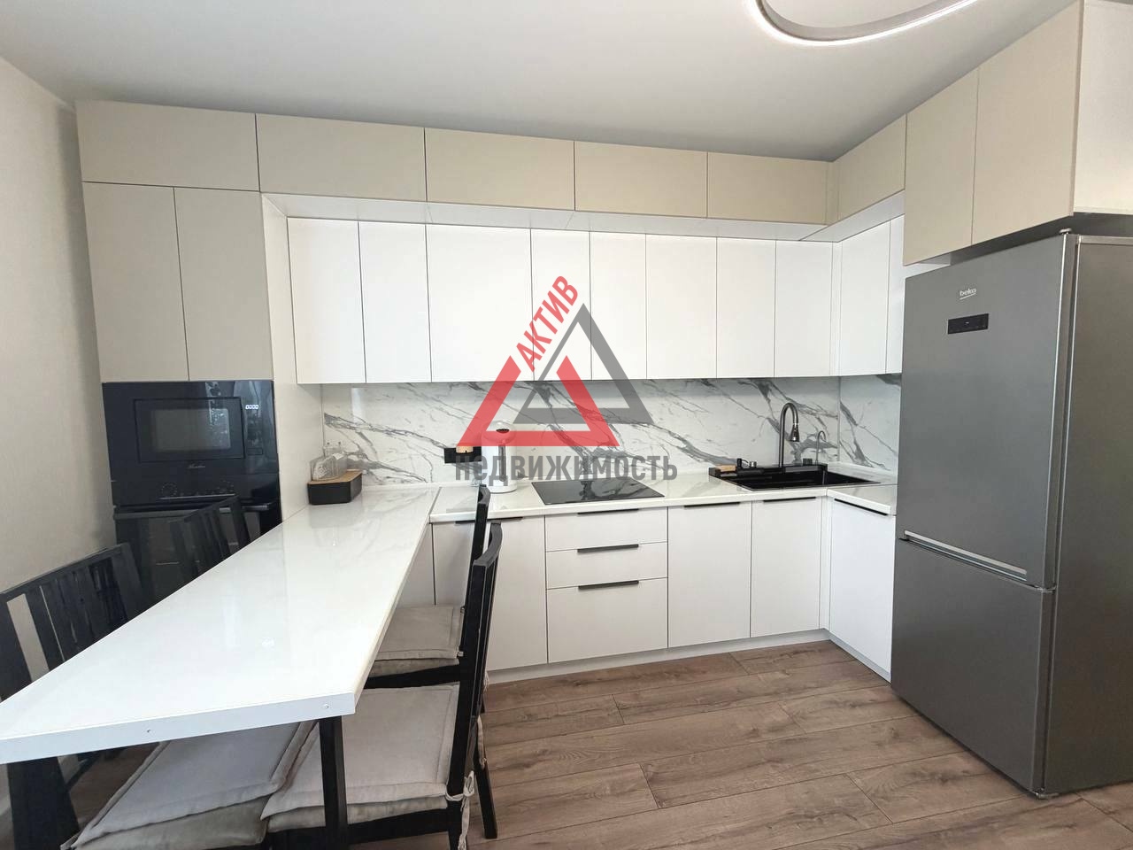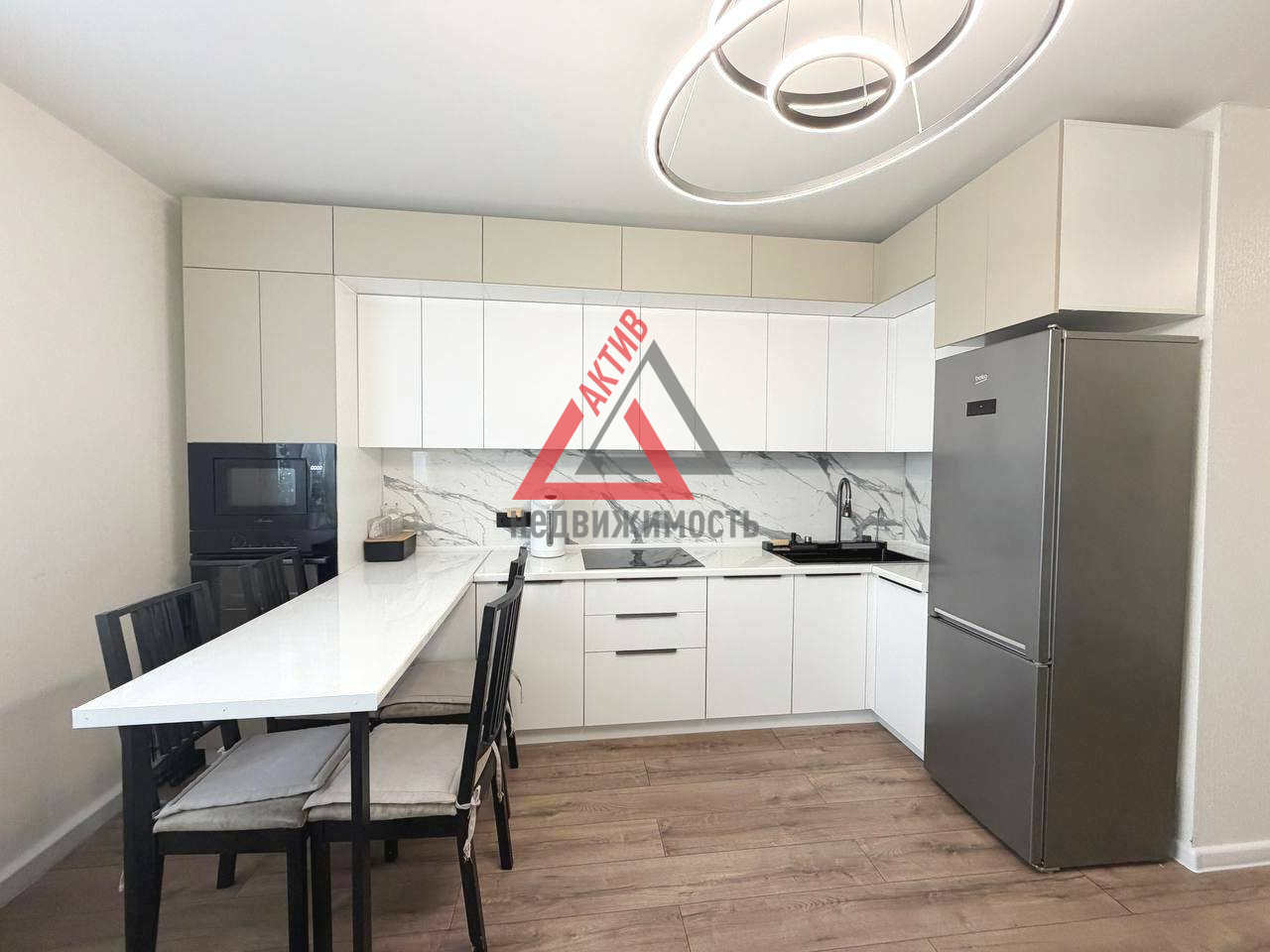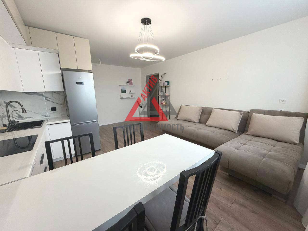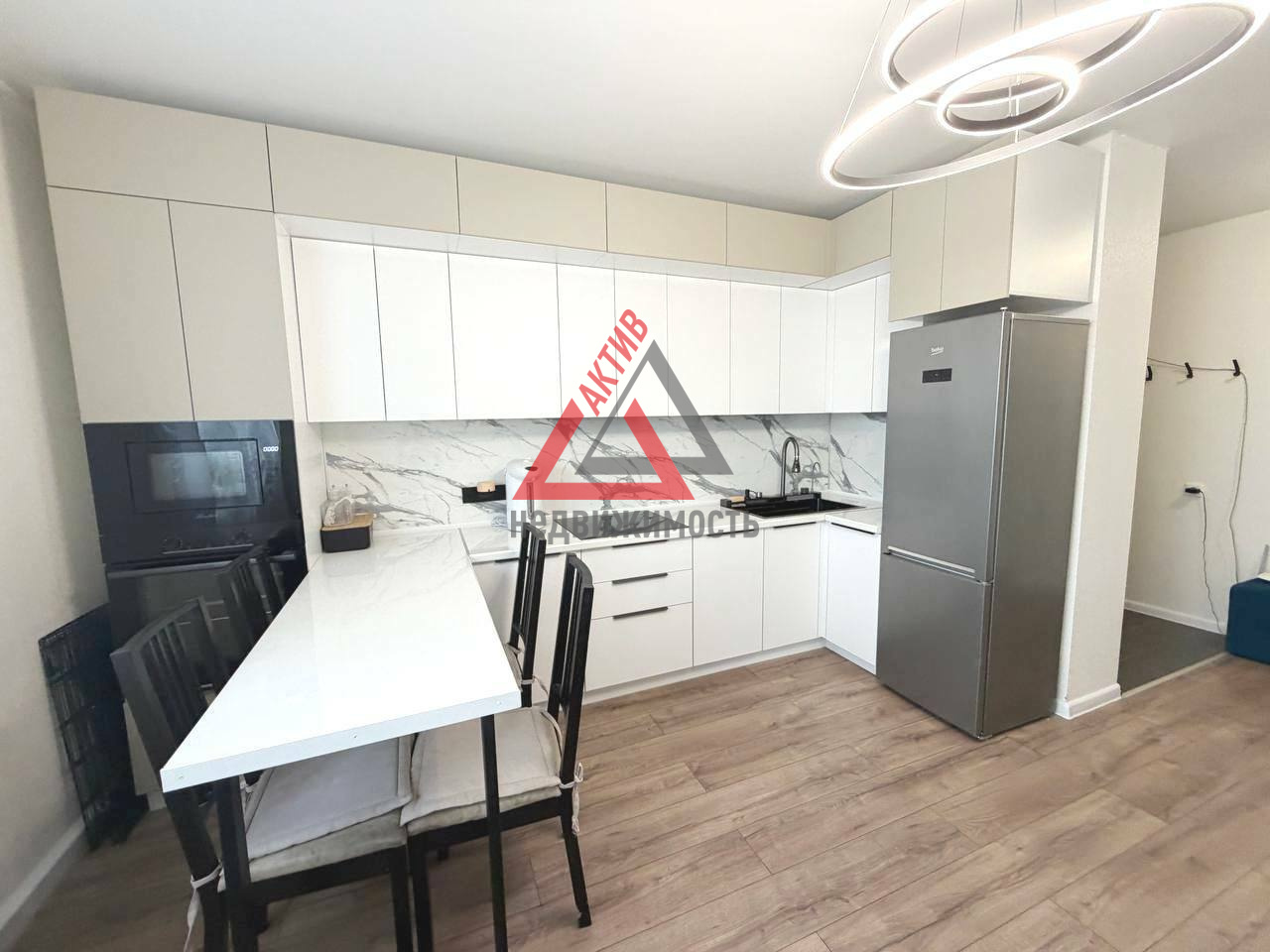 Функциональное зонирование: две просторные спальни и большая кухня-гостиная, где приятно проводить время всей семьей. Кухонный гарнитур с уже встроенной бытовой техникой – вам останется только расставить посуду!